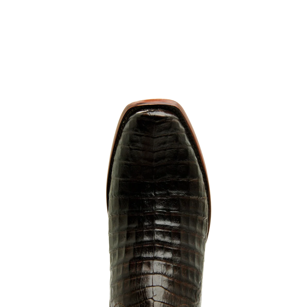 Made from rich chocolate caiman leather, this Western boot features a 7-inch shaft with smooth cowhide lining and easy pull tabs. A narrow square toe and 2-inch cowboy heel deliver classic style, while Goodyear welt construction and a leather sole with rubber insert ensure lasting durability and traction.