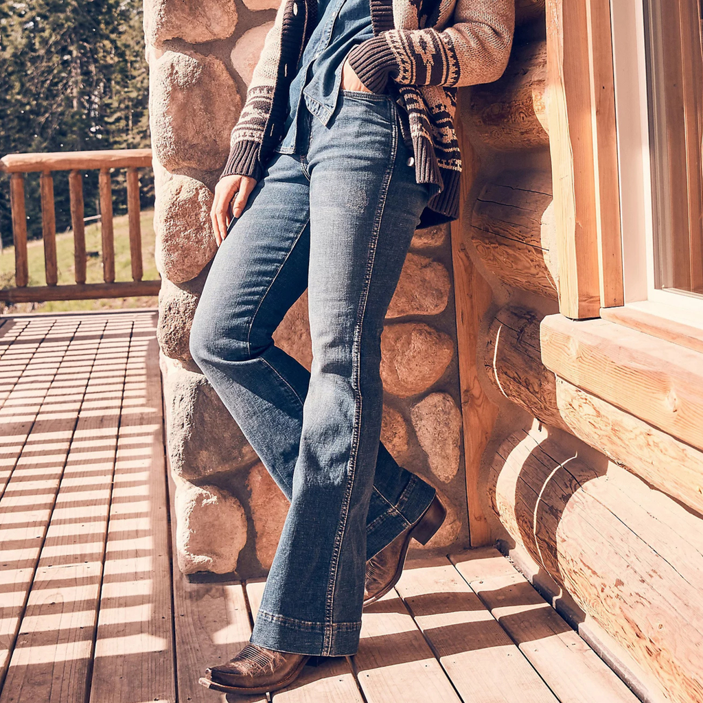 Flattering from every angle, the Bailey High Rise Trouser Jean is a go-to for women who love a vintage-inspired flare. Made from a soft cotton blend with a touch of stretch, it offers all-day comfort and a figure-enhancing high-rise fit. The close-fitting thigh and 20.5” flared leg create a timeless silhouette, while the five-pocket styling, signature “W” stitching, and logo patch deliver authentic Western style.